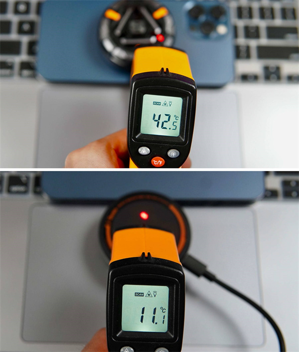 第一,严格来说其实也不是这款散热器的问题,而是手机自身磁吸环的位置,是在手机的正中间,但是手机发热最严重的地方,其实是在摄像头周边、尤其是靠下的这个区域,散热器显然不能对这个区域进行直接降温,这也让散热成绩有所打折。