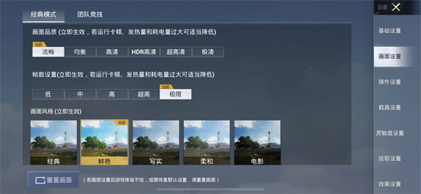 首先,为了尽可能的还原真实的游戏环境,和平精英的画质调到了流畅,帧率调到极限,风格选择鲜艳,这也是绝大多数手机玩家推荐的设置。