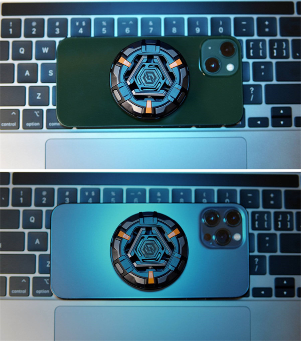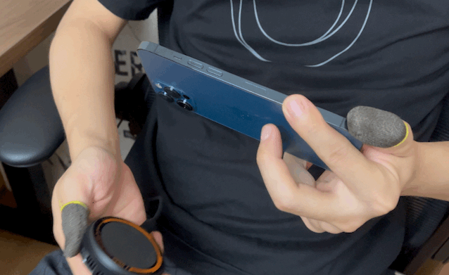 我个人平时玩游戏是使用 iPhone 12 ProMax,如果是使用小尺寸的 iPhone 12、13也完全不用担心会影响手感,因为散热器本身尺寸就小,而且磁吸在正中央,背后的手部空间还是足够的。
