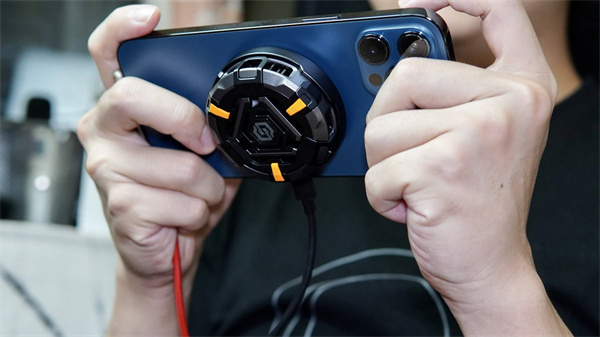 在这个时候连上电源线,把冰轮散热器优雅的磁吸到手机背后,因为 Magsafe 的加持,整个过程完全可以盲操,磁铁会自动对位。