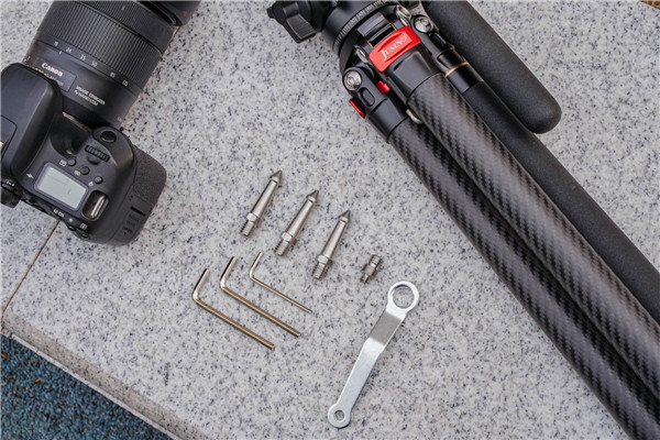 三脚架内置了一些常用工具。三个脚钉,三个六角螺丝,一个双头螺丝以及一个六角扳手。应对日常使用,还是完全足够了。