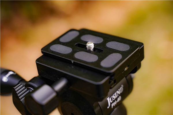 快装板固定牢固而且安装与拆卸非常方便。快装板支持1/4与3/8两种规格相机螺丝。1/4螺丝不用的时候则能够旋紧固定在把手固定的另一侧螺纹孔里。平时将螺丝收纳可以有效防止螺丝划伤三脚架。