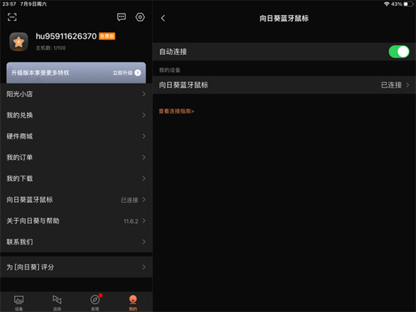 当连接完成后,进入向日葵远程控制软件,还需要一个小小的设置,在页面开启向日葵鼠标自动连接,这样才可以在远程控制过程中让鼠标的滚轮与右键实现PC的功能。