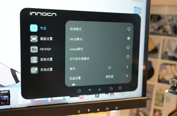 在显示器的右下方设有显示器的功能按键,在OSD选项菜单里,在专业模式选项里可以选择:标准、sRGB、Adobe、均匀性补偿模式,同时也可以进行画面设置,亮度调节,HDR开关,以及PIP/PBP模式的选择,菜单设置和其他设置的调节。