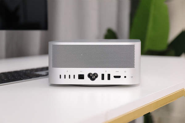 小小的Mac Studio也是一台高度集成化的设备。背部丰富的端口,展示着它对专业用户的包容。通过HDMI接口、千兆网口、3.5mm耳机接口以及USB-A接口,不同的设备都可以直接与Mac Studio连接。当我们还需要连接更多设备时,四个雷雳4端口也提供了足够丰富的扩展空间。