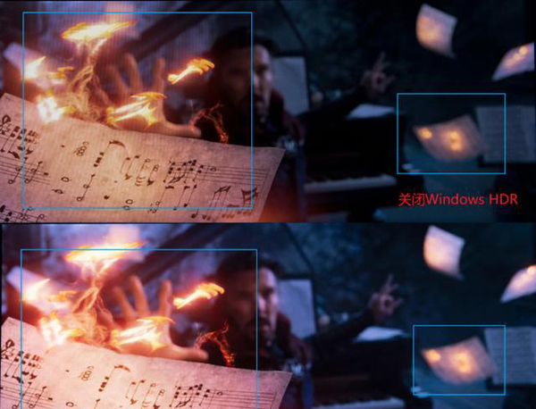 YOGA Air 14s还可以解码杜比视界影片,并且屏幕本身就符合杜比视界HDR认证。那么在开启Windows HDR功能后,YOGA Air 14s就能带来远比传统SDR内容层次感更强的观影效果(高光部分峰值亮度更大,阴影细节饱满,更接近真实世界的明暗对比场景),以下为屏幕实拍对比: