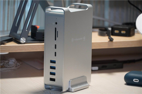 yottamaster雷电3扩展坞采用一个立式的设计,搭配一个立式的底座,放在桌面上就像一个装饰品,它的接口数多达15个,但是重量非常轻,15个接口分别分布在两侧,一侧的接口有3.5mm耳机接口、一个SD卡接口、一个tf卡接口、两个type-c接口、一个支持10Gbps传输速度的USB接口、两个支持5Gbps传输速度的USB接口、一个支持480Mbps传输速度的USB接口以及一个电源指示灯。
