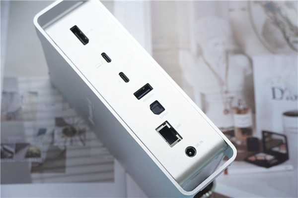 另一侧接口有DP1.4接口,一个雷电3输入口、一个雷电3输出口、一个支持480Mbps传输速度的USB接口、一个S/PDIF光纤音频口、一个千兆网口以及一个DC电源接口。