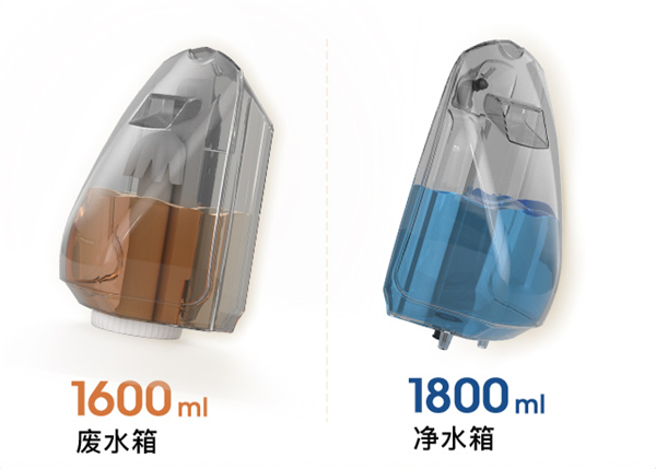正面为产品的logo标识,左右两侧黑色的部分分别为可视化的清水箱和污水回收箱,拆卸时通过两侧的扣手就可以打开。比较贴心的是在清水箱内侧还带有相应的使用标识,可以根据清洁面积大小注入相应的清水。根据官方介绍,其最多可容纳1800ml清水,深度清洁时可以提供长达30分钟的使用时间。污水箱的容量是1600ml,使用时可通过警示线随时查看污水情况。