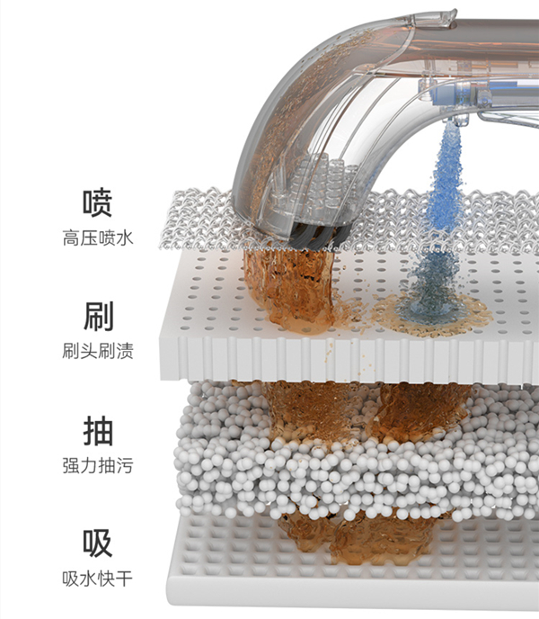 刷头下的刷毛是那种加密圆束刷毛,我们在清理污渍的时候,用这种刷毛来摩擦,可以很快地刷掉污渍,还不会损伤到织物材质。在吸入口下方有喷嘴,能均匀喷水,浸湿清理区域。这种喷水模式会让水分子更深层次地渗入到织物中,快即溶污。并且脏污污水会实时回收,可以很好地防止脏水下渗,除了表面的清洁,通过大吸力设计可进行深入织物2cm处深度清洁。