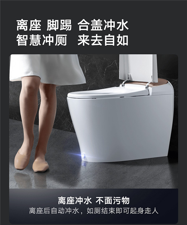 云米家用智能马桶Nano 2 pro支持自动翻盖翻圈的设计,马桶底部设计有按钮,在上厕所前,用脚尖轻轻的按压,即可实现自动翻盖翻圈,减少不必要的接触。这一功能对于男士来说很友好,小便后直接用脚轻踢马桶底部按钮,马桶就会自动冲水,省去了弯腰冲水的麻烦。更为便捷的是,它还配置了自动冲水和合盖冲水的功能,只要人离座,马桶就会自动冲水,合上盖也能自动冲水,不用担心忘记冲厕所,同时也避免了细菌异味的四处散布,保持卫生间空气清新。