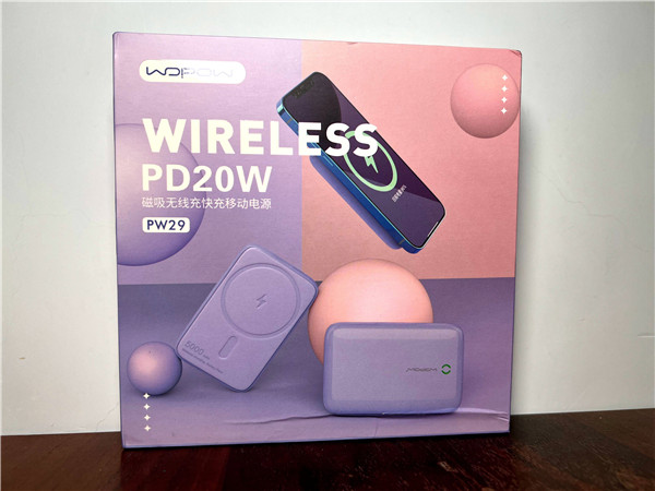 这次沃品磁吸快充移动电源 PW29一共推出了4种配色,分别为珍珠白,胭脂红,丁香紫,柠檬黄。我上手的是其中的丁香紫。这个从产品外包装盒正面就能看出来。除正中心位置的产品渲染图外,左上角还有品牌LOGO和产品名称。