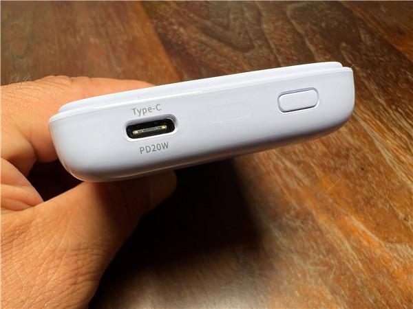 磁吸无线快充移动电源顶部标配了一个Type-C接口,一个电源按键。C口支持最高20W的输出。