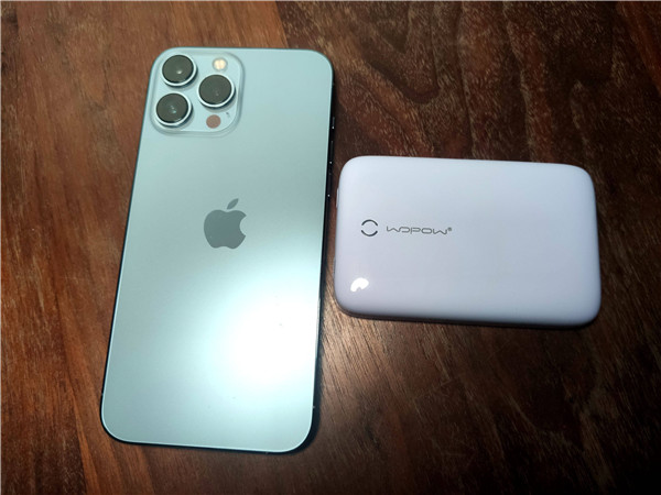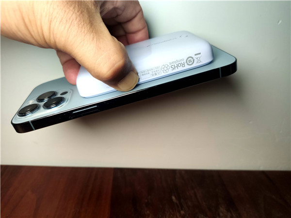 使用沃品磁吸无线快充移动电源PW29,给iPhone 13 Pro进行磁吸无线充时,吸附力度不错,拿着电池就可以轻松提起iPhone 13 Pro。同时,移动电源与相机镜头还有一段距离,拍照时移动电源不会遮挡摄像头部分。
