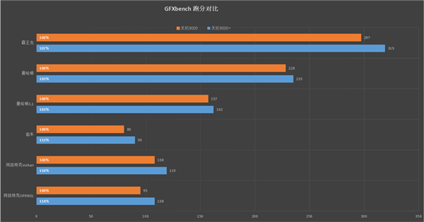 GFXbench测试,首先是逐项单个测试,可以避开发热对后续项目跑分的影响。可以看到天玑9000+在不同的测试项目中的领先在3%到14%不等,综合平均提升在8%左右。
