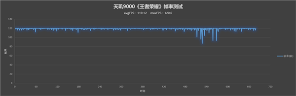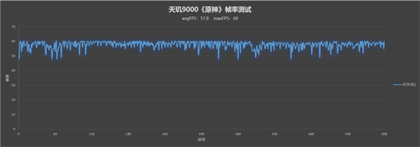 天玑9000+的帧率相较于9000更高且更稳,平均帧率58.9 FPS,通过帧率图也能看出波动更小,游戏过程更加流畅。