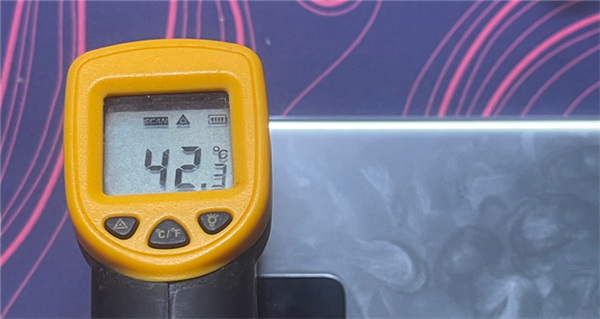 室温24℃,游戏过程中,天玑9000+的平均整机功率为3.8W,体现在后盖温度上,前者为42.3℃,后者为41℃。功耗更低,温度表现更好。