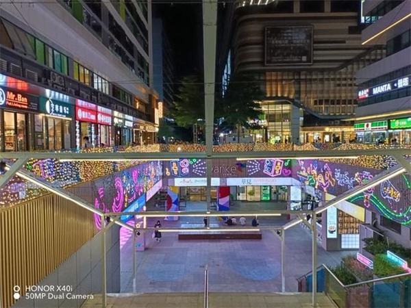夜景才是真正考验影像能力的场景,在面对夜景中复杂的灯箱光源,荣耀X40i不但抑制了高光的溢出,还保证了整体画面的纯净度,它并没有像其他机型那样追求亮恍恍的夜景,把曝光拉得很高从而形成噪点,整体的夜景成像效果可以说是超出我的预期的。