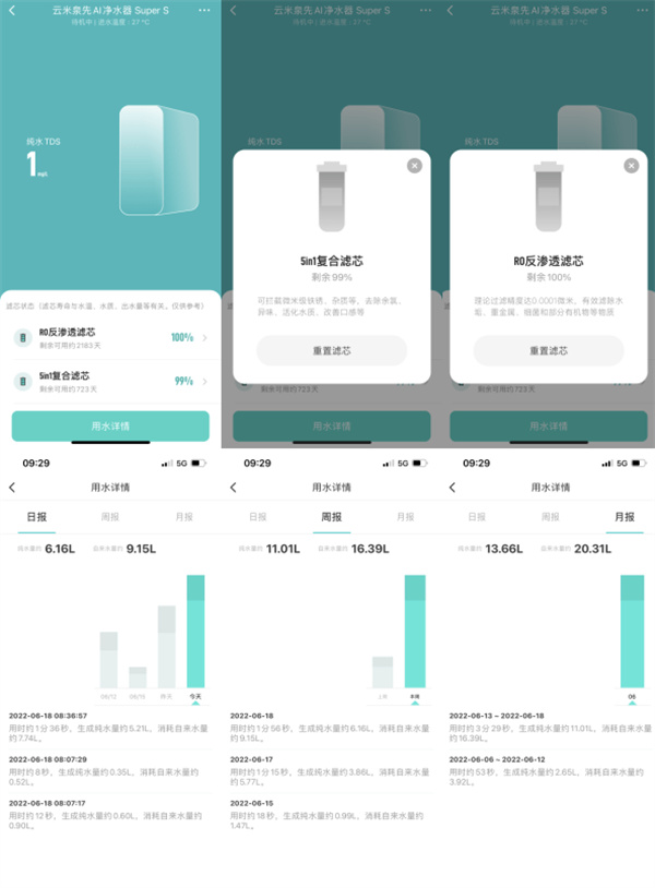在APP端可以实时查看出水水质情况,还有每个月、每周每天用水的情况,以及滤芯剩余可使用时间情况,方便用户更换。用户还可以在设置中心设置清洗滤芯时间、固件升级以及滤芯的购买等,总体感觉功能齐全,APP界面清爽。