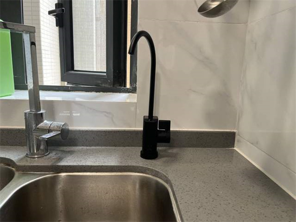台上部分,台面瓷砖开孔和净水器的水龙头完美融合,一黑一白两个水龙头还是非常不错,云米的这款颜值也是非常不错。