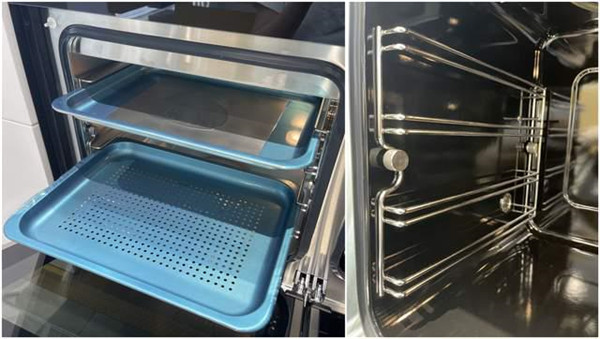 再来看看它的烤箱,拥有32L的容量,使用一体拉伸搪瓷内胆,另外搭配了空气烤锅,能过滤油脂,吃的更健康,尤其是给孩子吃,清洗也很方便,用水一冲即可。