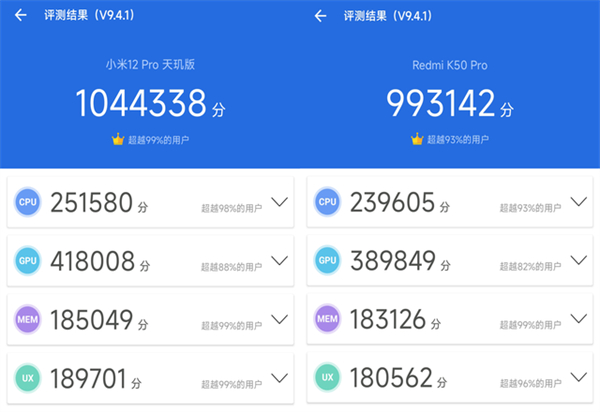 首先是安兔兔,小米 12 Pro 天玑版跑出了 1044338 分的成绩,相比搭载天玑 9000 的 Redmi K50 Pro 的 993142 分要高出 5 万多分,确实有一定程度的提升。具体到子项分数上,CPU 高出 1W + 分,GPU 高出 2W + 分。