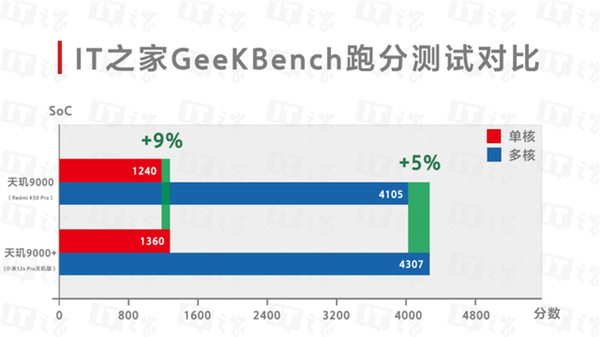 在 GeekBench 的测试中,搭载天玑 9000 + 的小米 12 Pro 天玑版跑出了单核 1360 分,多核 4307 分的成绩,对比我们测过搭载天玑 9000 的 Redmi K50 Pro 单核提升约 9%,多核提升则达到了 5%。这组成绩也比较符合官方宣称的提升幅度。