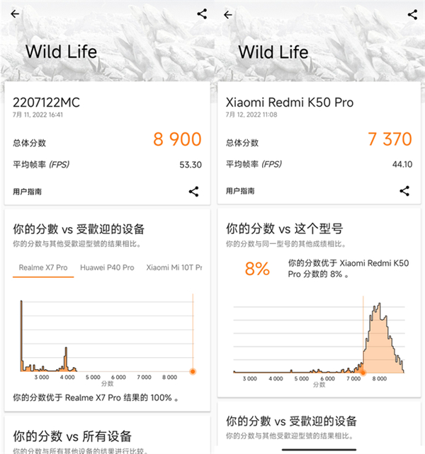 最后在侧重 GPU 性能的 3D Mark Wild Life 测试中,小米 12 Pro 天玑版获得了 8900 分的成绩,而 Redmi K50 Pro 则获得了 7370 分的成绩。可以看到在跑分环节,天玑 9000 + 的每一项数据相比天玑 9000 都有提升,虽然体现在纸面上并没有高很多,但作为小改款,联发科进一步压榨出这颗 SoC 的性能潜力。