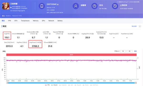 在王者荣耀中,我们选择最高画质,关闭动态分辨率,一局 20 分钟左右的游戏之后,这颗天玑 9000 + 的平均帧率为 119.1 帧,帧率曲线整体为一条直线,功耗则在 3.7W 左右。