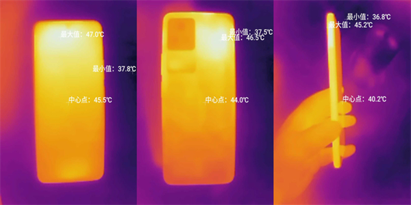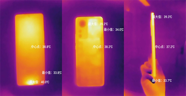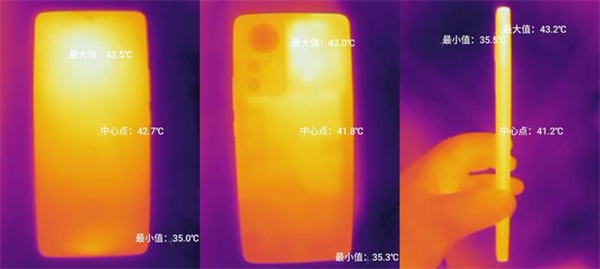 温度方面,机身正面最高温度为 43.5 度,背面最高温度为 43 度,中框最高温度为 43.2 度,虽说算不上“冻手”,但至少可以愉快玩耍了。看到这你可能还觉得感知不明显,无非就是温度低了一些,但接下来的对比有些出乎意料。