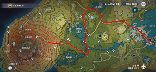 然后是大家的老朋友原神,单独交代一下测试路线,测试路线固定,如图所示游戏时间统一调为 19:00 整由璃月港南部锚点向北出发,经过北部锚点后沿天衡山北侧官道一路向西北前进,途径遁玉陵、灵矩关和青墟浦,最后抵达层岩巨渊上层,路上有怪打怪,有矿挖矿,不进行地图传送或打开设置菜单等影响瞬时帧数的操作。游戏画质设置为全最高,关闭动态模糊,帧数改为 60 帧。
