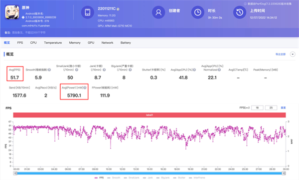 经过 30 分钟的游戏之后,小米 12 Pro 天玑版最终的平均帧数为 58.2 帧,虽然整体的波动幅度比较明显,但还是稳定成了近似一条直线,而且功耗也只有 5.5W 左右。