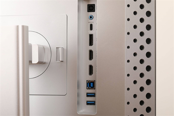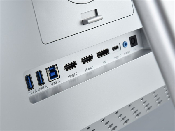 接口部分,显示器搭载了一个DP 1.4、两个HDMI 2.0、两个USB 3.0、一个USB上行,一个全功能Type-C,以及3.5mm音频的丰富配置。其中,全功能Type-C接口支持一线直连功能,在连接移动设备时不仅能实现音视频传输,还能为设备提供最高90W的反向供电。