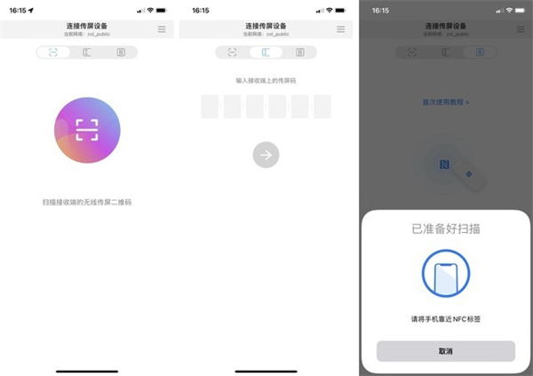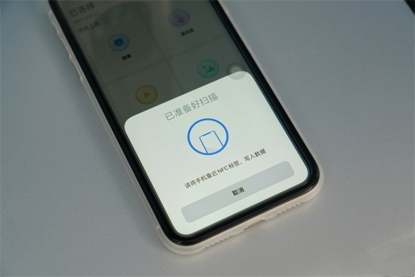 以苹果手机为例,通过“希象传屏”APP,可以支持扫码、传屏码、NFC三种无线投屏模式。首次使用NFC连接时,需要将手机贴在NFC标签上等待写入数据。后续只需将手机放置在标签上,就能自动识别并跳转至投屏界面。