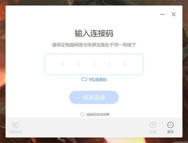 桌面端的投屏方式相对移动端来说就比较单一,不过连接方式也非常便捷。将电脑和显示器连接同一无线网络,输入显示器默认的连接码就能实现投屏。