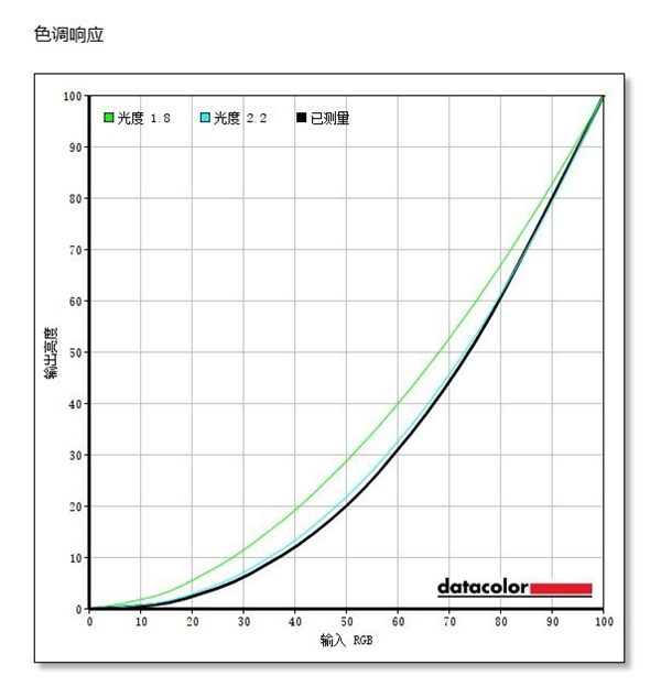 色调响应方面,已测量的黑色曲线应该尽量和浅蓝色的“光度2.2”曲线保持一致,可以看到实测的黑色曲线和“光度2.2”偏差较小,色调响应的表现较好。