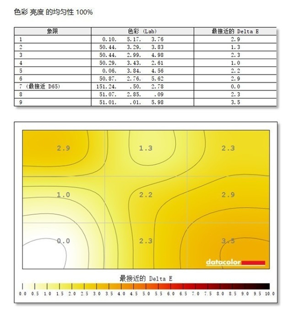 在色彩均匀性的测试中,可以看出INNOCN 27P1U的第7象限最接近D65的标准,显示器面板的第9象限与标准色温值有一定差距,差距数值为3.5.显示器整体的色彩均匀度表现很出色。