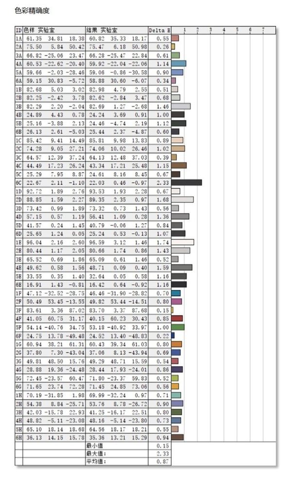 色彩精确度方面,INNOCN 27P1U测试的48种颜色平均△E值仅为0.87.当0<△E<2时,人眼基本上分辨不出色彩的差异,由此可见,这款显示器的色彩还原能力非常优秀。