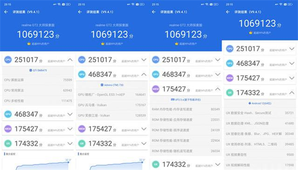安兔兔跑分1069123分,接近107w分的成绩,可以看到在CPU和GPU方面有明显提高,内存方面全球首发新款LPDDR5x存储芯片,在存取速度上也有一定升级。