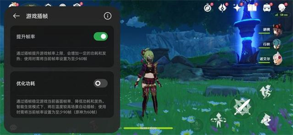 真我 GT2 大师探索版这次还首发搭载了新一代 X7 独显芯片,最高支持4倍(30fps插120fps)插帧技术,插帧时延最低可达10ms,可以提高我们的游戏操作上限。像是安卓端的原神帧率上限只有60帧,我们可以通过游戏助手中的游戏插帧,来将帧率提高到90帧,获得更流畅的游戏体验,也可以通过优化功耗来降低功耗和发热。