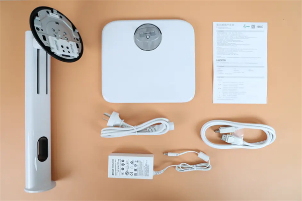 ▲配件一览,包括了支架和底座,外置电源适配器和电源线、DP 视频线X1、用户手册X1。
