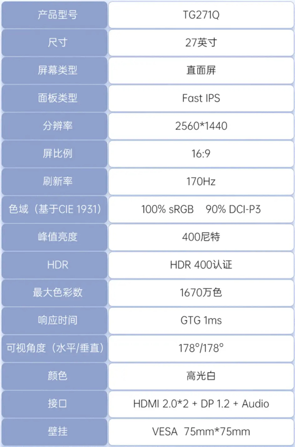 ️总结:如果你想买一台2000元价格以内,采用白色外观设计且拥有不俗性能的电竞游戏显示器,HKC TG271Q应该是这个价位非常不错的选择。