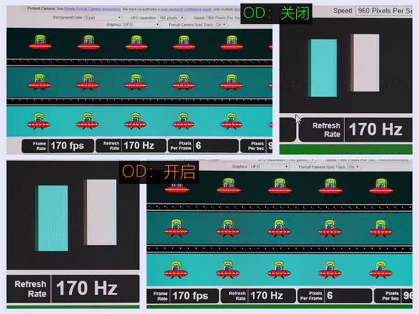 分析:得益于友达8.2 Fast IPS面板良好的素质,TG271Q的整体响应速度非常快,在OD加速关闭的情况下,响应时间都是GTG 4.5-5ms起步;而开启OD加速功能后,表现会进一步增强,直接来到GTG 3.5-4ms区间,几乎已经达到了目前市面上电竞显示器第一梯队的水平。实际UFO test测试中也很难观察到拖影的出现,更令人欣喜的是OD加速开启也完全没有鬼影或者伪像出现,在如此高速的响应速度下还能保证如此效果,实属不易。