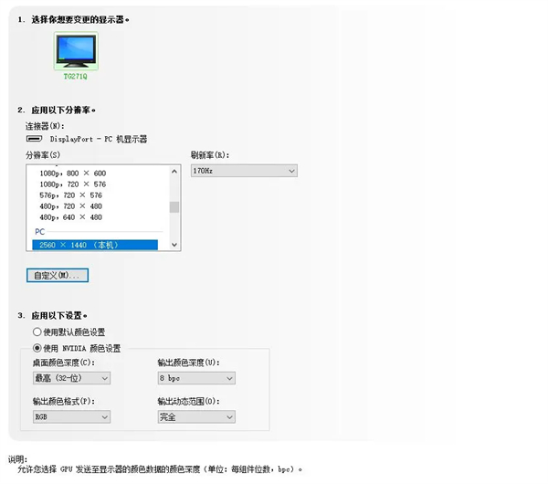 原生8bit,可以抖动到10bit。但是受限于DP1.2带宽设计,此时要降刷新率到120hz。