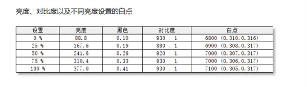 SDR状态下最高亮度为377nit,此时对比度为930:1,属于普通水平。