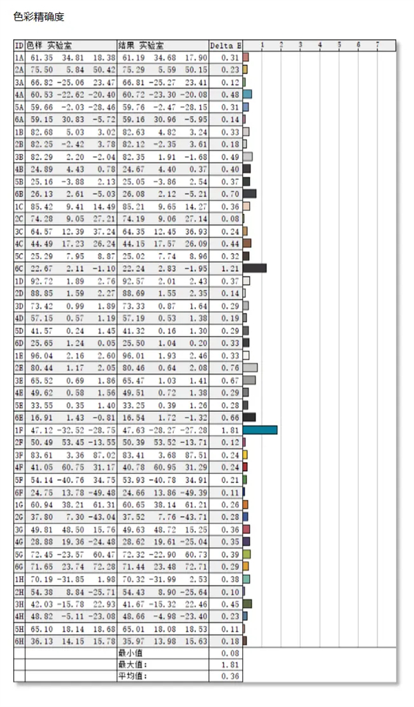 实测默认状态下平均色差△E仅为0.36!最大偏差是蓝色,也仅为1.81!