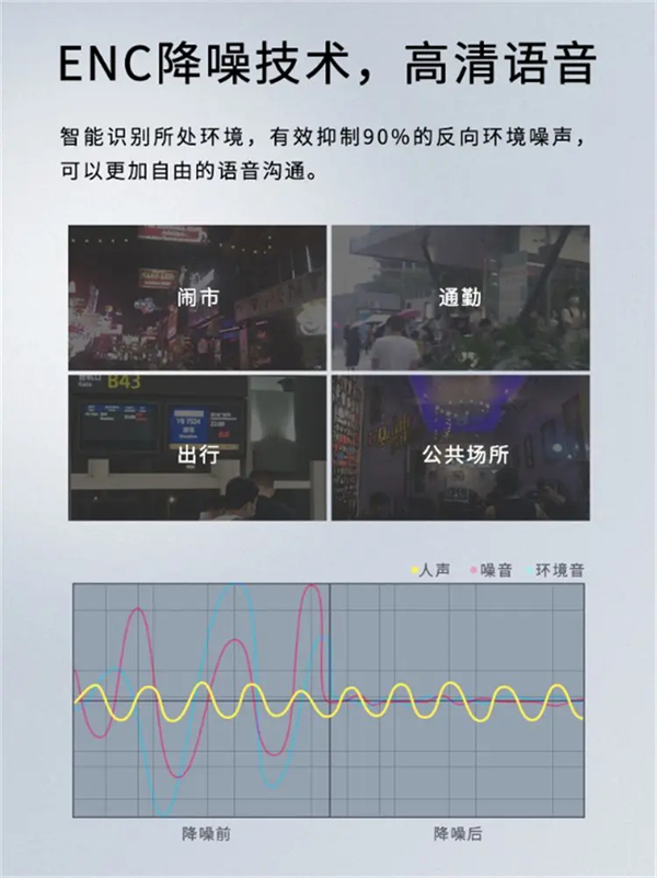 有朋友要问了,如果音质如你所测的那样确实不错,那你肯定是在安静的环境下视听的,我们需要的是能够在嘈杂环境中依然能很好展现音乐表现的耳机。诚然,喜欢听音乐的朋友都喜欢在内心保留一处放空之地,当他们戴上耳机,隔绝外界的嘈杂声音,便会进入那个地方,缓解一天的紧张和焦虑。雪豆 Snowpea的降噪也没让人失望,它搭载了ENC(Environmental Noise Cancellation,环境降噪技术),能有效抑制90%的反向环境噪音,降低环境噪音最高可达-20dB,结合硬件算法还能去除环境中的各种干扰,让用户无论在电话聊天还是游戏语音场景中都能轻松拿捏。