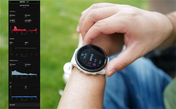 使用时,按下右侧的功能键、平放手腕、等候两分钟的检测时间、手表马达震动提示,即可以查看心率、脉搏血氧、呼吸频率、压力和 HRV 心率变异性五项核心指标的数值。