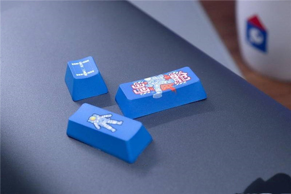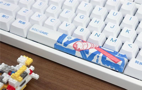 方向键上方标有ikbc|CASC的联名LOGO,这一LOGO也出现在空格键的涂装左侧,如下图所示,键帽右侧有大面积的天宫涂装,这里的配色除了太空蓝之外,还有让人倍感鼓舞的中国红,还有一处红色出现在3枚定制键帽的回车键之上,而且“回车”也被改为了“出舱”,这是我们中国人的一小步,却是未来踏踏实实每一步的缩影。