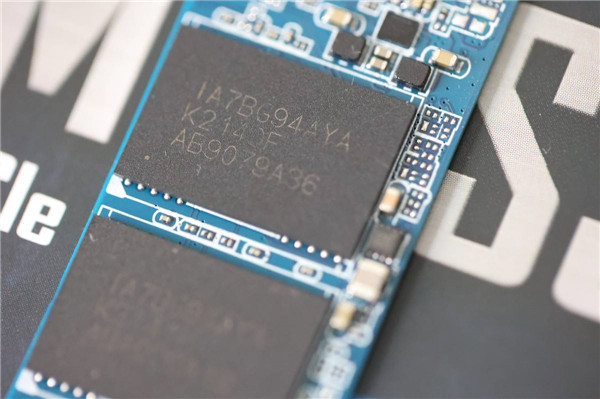 撕开上面的铭牌贴纸,就可以很清晰的看到主控芯片和闪存芯片了。可以看到技嘉GM2 500GB使用的是群联PS5015-E15T主控和3D NAND闪存,主控支持NVMe1.4协议。闪存颗粒编号是IA7BG94AYA,这是美光原厂的176层堆叠3D TLC颗粒,采用了ONFI总线技术,单通道速度可达1600MT/s,单颗容量为256G。值得一提的是技嘉GM2500GB还有HMB功能,也就是主机内存缓冲区功能,可以利用PCI-E的DMA,允许SSD使用PC系统上的部分内存,而不是需要SSD自带缓存,这样的设计在传输速度上会更加稳定。